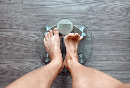 Man stand on the digital weight scale. Diet, weight loss, overweight, obesity and health concept