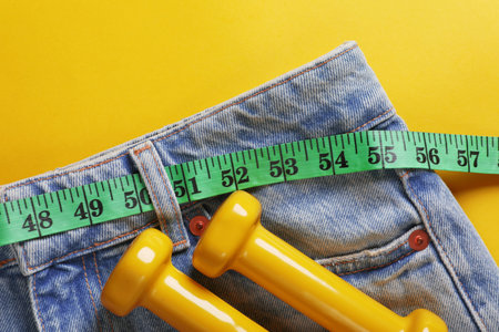 Jeans with measuring tape and dumbbells on yellow background, top view. weight loss concept