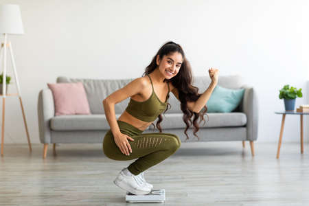 Triumphant young Indian woman sitting on scales, making YES gesture, happy with result of her weight loss diet at home