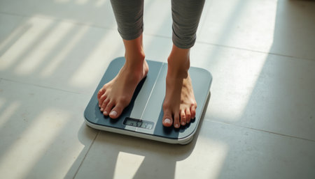 Person weighing themselves on a scale in a sunlit room