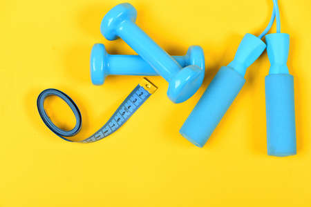 Flat lay top view scales, dumbbell and tape measure on white yellow background