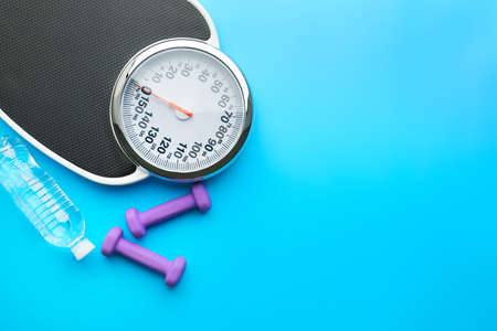 Scales, dumbbells and bottle of water on color background. Weight loss concept