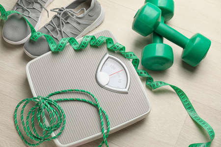 Weight scales with measuring tape, sport shoes and dumbbells on wooden background. Slimming concept
