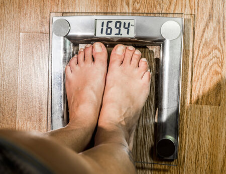 Woman standing on scales. Weight loss concept