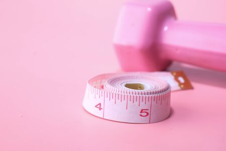 Close up of dumbbell and measure tape on pink