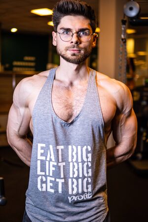 RUSSIA, MOSCOW - November 22, 2019. Fitness club. The strongest man in the country, bodybuilder with hands on the belt, elastic buttocks, beautiful pres in a white T-shirt. Serious muscles, sitting on the simulator hands behind his back.