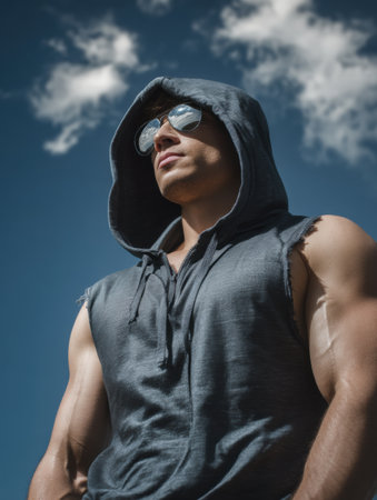 Muscular man wearing a sleeveless hoodie poses confidently outdoors under a blue sky with fluffy clouds, reflecting a sense of determination and strength.