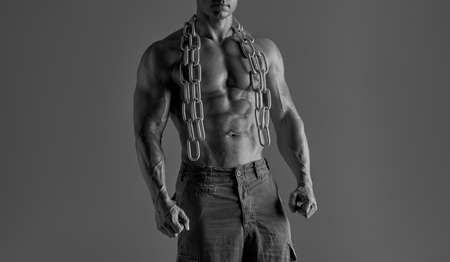 Sexy man with naked torso. Strong muscular male body, muscles guy. Confident attractive man with serious face.