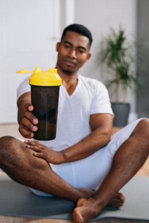 Blurred view of confident muscular African-American man sitting cross-legged relaxing on exercise mat after workout and holding proposing bottle of fresh mineral water at domestic room.