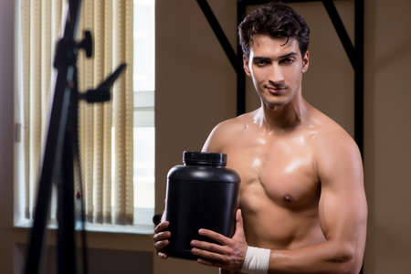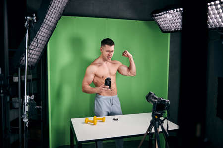 Muscular bodybuilder with jar of protein on a black background. Sports nutrition. Bodybuilding nutrition supplements, workout, healthy lifestyle concept.