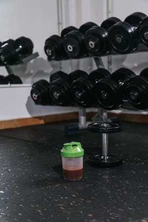 Protein shake and dumbbells at the gym. Fitness nutrition drink and heavy weights.P