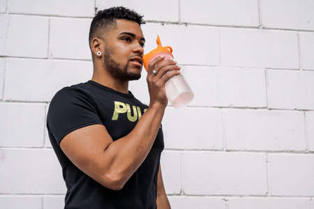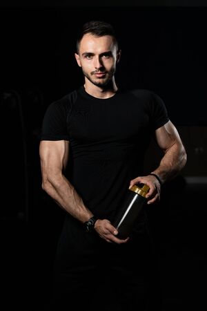 Muscular Man Resting After Exercise And Drinking From Shaker