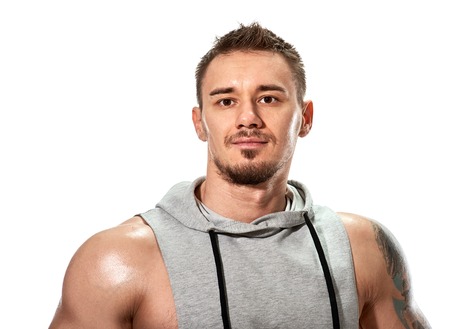 portrait of a young bearded athlete, in a sports sweater, on a gray background. Promotional photo of an athlete guy, for a sports catalog, magazine. Fashion and sport. Running t-shirt. Studio photo of an athlete