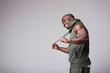 African American man in a tracksuit holds a rope hood from a hood with his hands and smiles happily in a studio