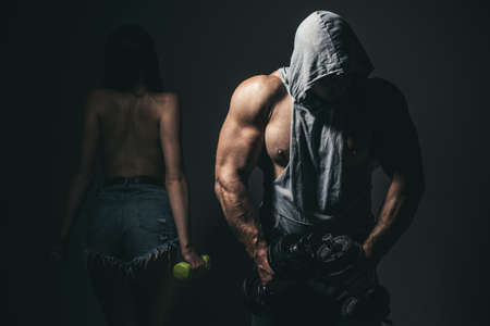 Sporty sexy couple showing muscle and workout wiht dumbbell. Sportive woman and man, team. Sport, dumbbell, fitness, couple sports. Man and woman torso. Sports fitness sexy girl, boobs.