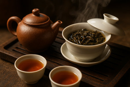 A refined Chinese tea set, featuring a dark clay teapot and a white ceramic gaiwan with tea leaves, sits on a wooden serving tray in dim, atmospheric lighting. Steam rises from the hot tea, emphasizing the tradition, ritual, and tranquility of the tea ceremony.