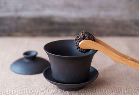 Chinese Puer tea in the shape of a ball in a wooden forceps before you brew in a gaiwan