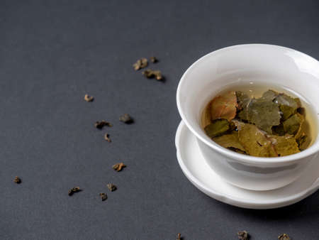 a white bowl with brewed tea leaves on a dark background. Close up, side view. Chinese tea, open leaves