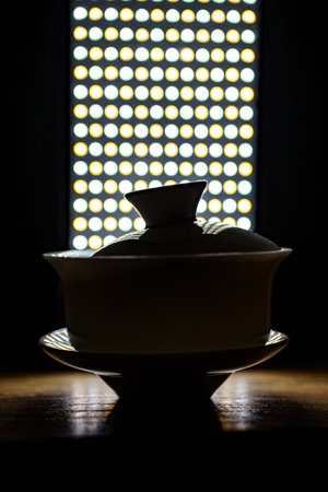 Gaiwan or tea cup for Chinese tea ceremony on wooden background. Copy space.