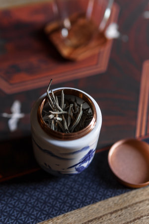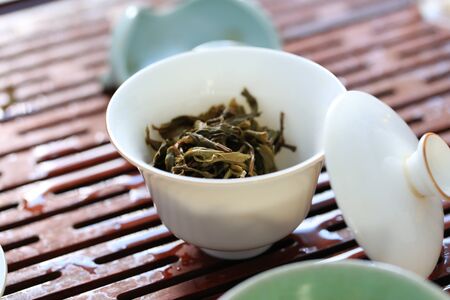 Dried leaves of Chinese tea in a beautiful kiramic soda. Tea ceremony. Red traditional Chinese drink. Dark utensils.