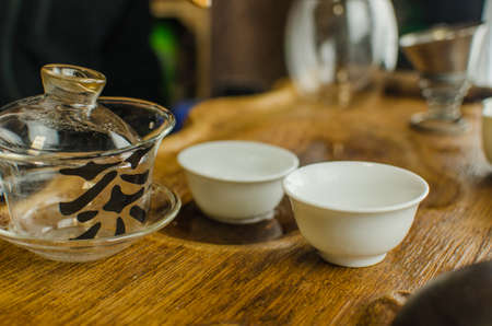 Japanese tea ceremony. Set of cups and saucers on the table.