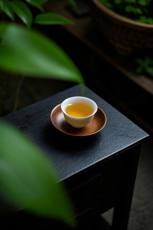 Warm cup of tea on a rustic stone table in a cozy indoor setting during a tranquil afternoon