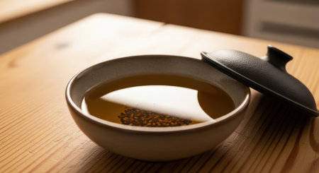 A shallow ceramic bowl holds a steaming, amber-colored drink, casting gentle reflections. A dark handle rests beside it, suggesting a serving of tea or coffee.
