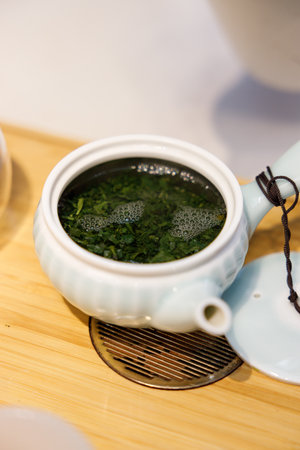 Closeup of fresh green tea leaves in tea pot. Selective focus.