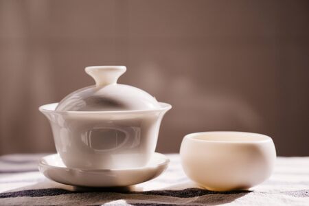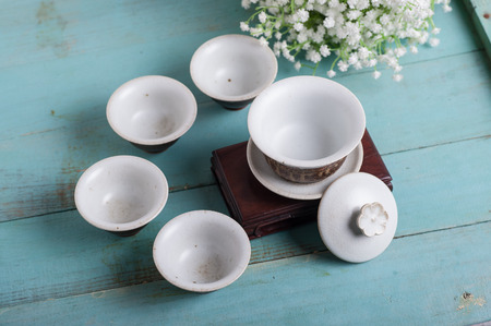 Chinese Oolong Tea ceramic gaiwan lidded bowl and small cups used for brewing and serving