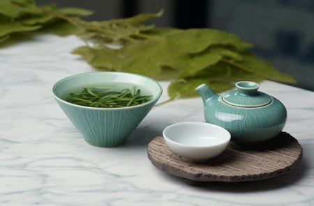 Enjoy the delightful essence of Fresh Green Tea Leaves in beautiful Traditional Teaware