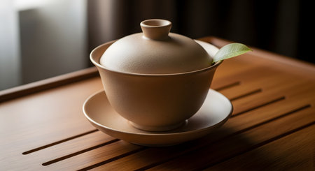 An elegant, traditional Chinese gaiwan (a lidded bowl for brewing and drinking tea) sits on a slatted wooden tea tray. The ceramic cup has a simple, earthy texture, and a single fresh green tea leaf rests on the lid. The scene evokes the tranquility and artistry of the traditional tea ceremony.
