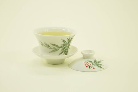 Dry Chinese oolong tea leaf and oolong tea in traditional cup on white, gaiwan tea