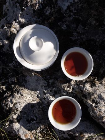 Traveling concept. Making black tea in white Chinese gaiwan and cups on big rock top view copy space