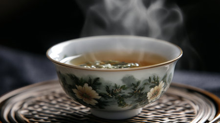Enjoying the delightful experience of steaming tea served in a traditional bowl atop a bamboo mat