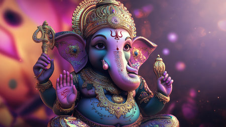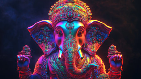 A digital art piece showcasing a colorful idol of Lord Ganesha in a festive setting.
