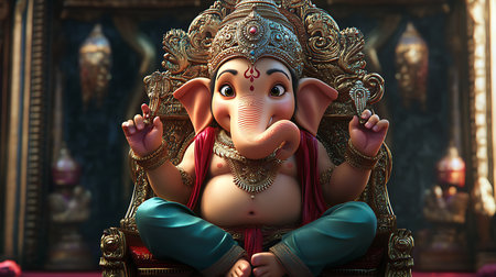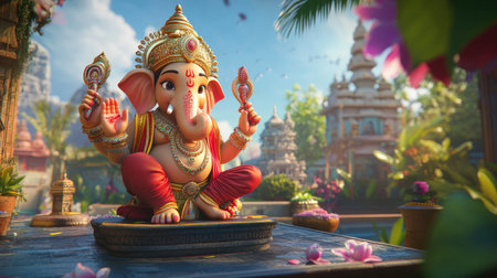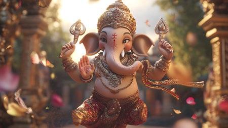 A vivid depiction of Lord Ganesha embodying joy and abundance in a serene temple setting.