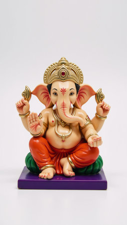 A colorful Hindu idol of Ganesh for offering prayers and good luck at festivals such as Ganesh Chaturthi weddings or ceremonies with white backdrop
