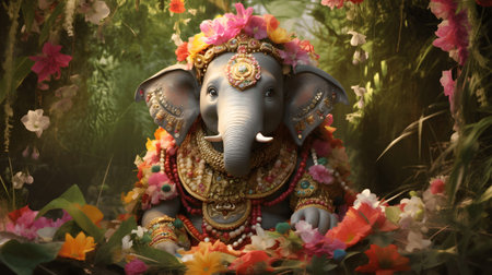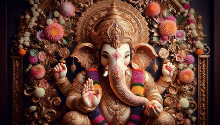 This captivating image features a detailed Lord Ganesha statue adorned with intricate designs, surrounded by vibrant flowers in a rich cultural setting.