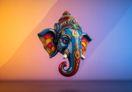 A vibrant, detailed sculpture of Ganeshas head, showcasing intricate patterns and a striking color palette against a soft gradient background.