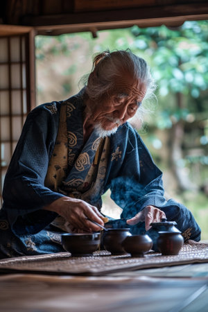 An old man is sitting in a room with a bowl of tea in front of him. He is wearing a blue robe and has a beard. The atmosphere of the image is calm and peaceful