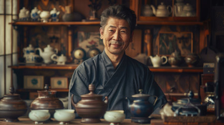 An elegant portrait of a wise senior Asian man with a white beard. He is sitting peacefully in a traditional Japanese zen garden with moss and sand.