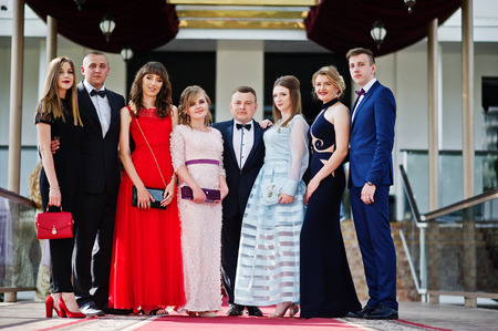 Portrait of an elegant people strictly dressed in black tie standing together at the luxury restaurant hall