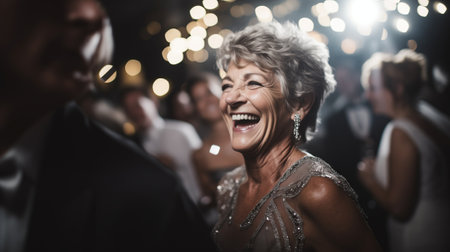 Group of happy people in formalwear dancing and having fun together with confetti flying all around