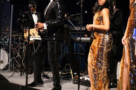 Fashion and holidays. Beautiful young people in luxury evening dresses with lit sparklers in their hands at a gala celebration. The background of shiny golden curtains.
