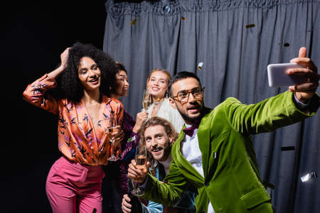 stylish interracial friends in bright clothes taking selfie on smartphone near gray curtain on black background
