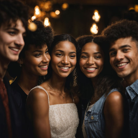Waist up portrait of multi-ethnic group of friends smiling happily while enjoying elegant party