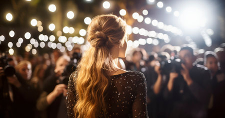 Beautiful woman dressed in retro style as a famous movie actress arriving on the awards ceremony with photo reporters taking pictures of her