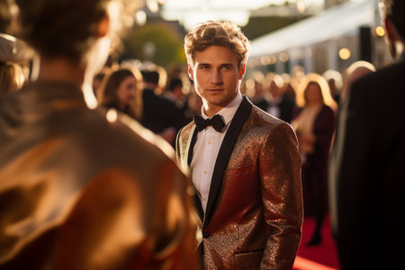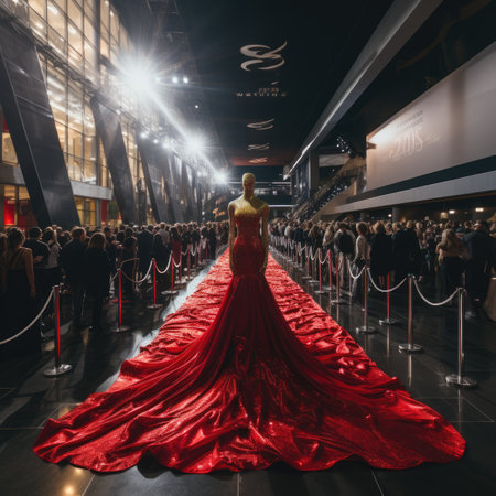 Red carpet with ropes and golden barriers on a luxury party entrance, cinema premiere film festival event award gala ceremony, wealthy rich guests arriving, outdoor decoration elements, a summer day