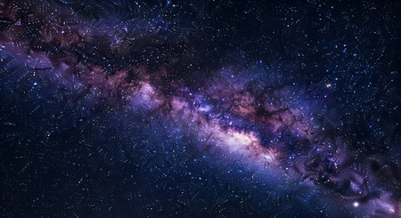 The majestic Milky Way galaxy stretches across the frame, a swirling band of stars, dust, and gas in shades of purple and blue. The dark expanse of space is dotted with countless tiny stars, creating a sense of immense depth and wonder. This image captures the beauty of our galaxy.