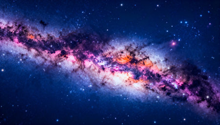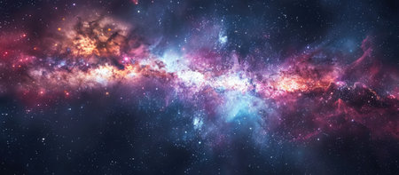 An awe-inspiring view of the vast galaxy, showcasing bright stars, colorful cosmic nebulae, and deep dark matter against the backdrop of infinite space. Perfect for artwork.